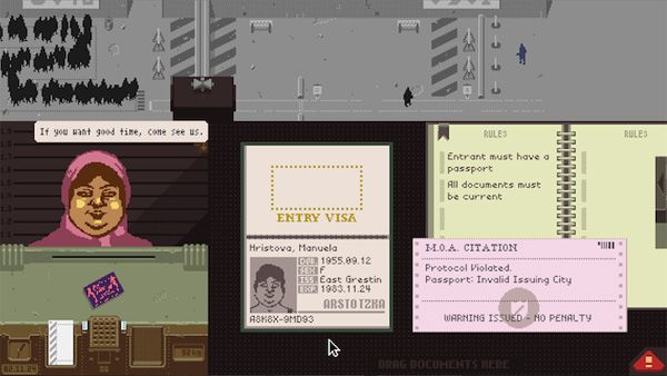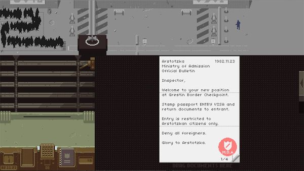 Citoyen du beau pays d'Arstotzka, vous avez été sélectionné par la grande loterie d'octobre pour devenir un administrateur de la frontière à Grestin. Vous emménagez donc dans votre appartement de fonction avec votre famille qu'il vous faut maintenant nourrir et chauffer car la situation n'est pas brillante dans le pays (